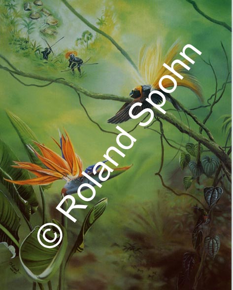| Strelitzia reginae | Paradiesvogelblume | - Ölbild (Pflanze in Kombination mit Paradiesvogel und Papuas von Neuguinea)
